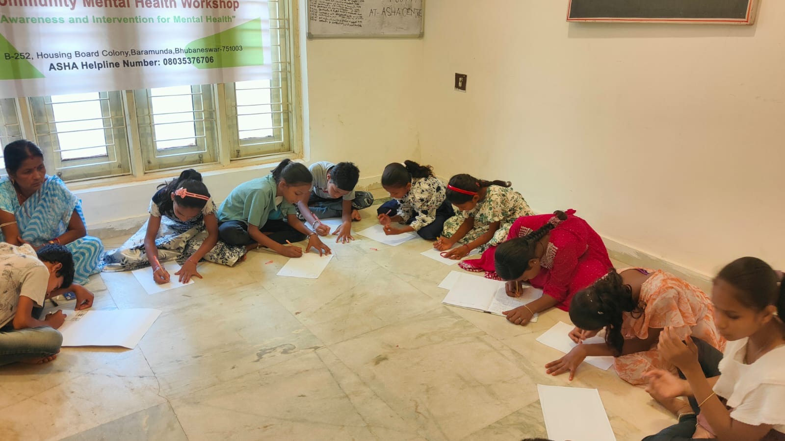 The workshop was conducted on 8th of April, 2025 in ASHA centre, Baramunda with the adolescents of Godamsahi slum with a focus on acknowledging their safe space and current emotions through art therapy. 08-04-2025- ASHA WORKSHOP